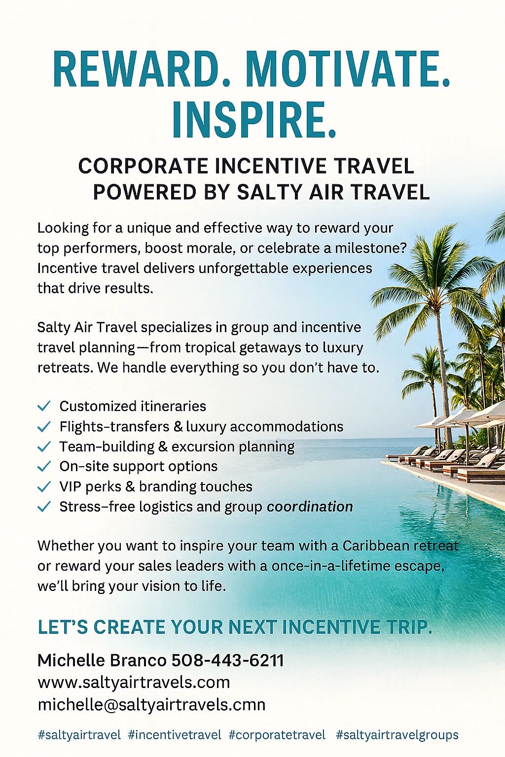 At Salty Air Travel, we make corporate incentive travel effortless, impactful, and unforgettable. Whether you’re rewarding top performers, boosting morale, or celebrating company milestones, we design custom group trips that strengthen team connections and showcase your brand traveler or a first-time explorer, we're here to help you plan your next adventure.
